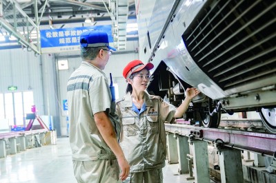 动车组机械师在进行车辆检修排查。资料图片